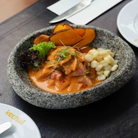 Masa de papa amarilla, acompañadas de pollo, camarón y pu...