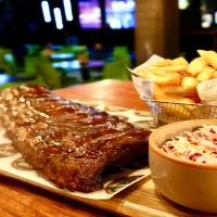 Rack de baby back ribs ahumadas lentamente con leña y gla...