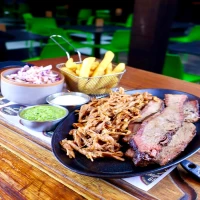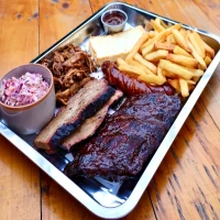 Porcion de brisket ahumado, pulled pork, baby back ribs j...