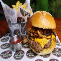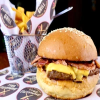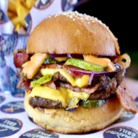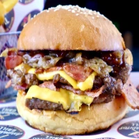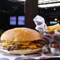 Doble smash de carne ahumada, queso cheddar, bacon, cebol...