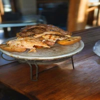 Milanesa de carne o pollo coronada con cebolla carameliza...