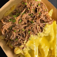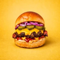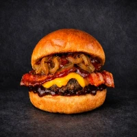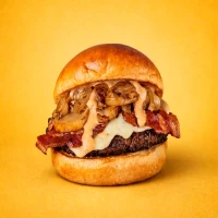 Hamburguersa de 150grs, cebolla caramelizada, queso cheddar, tocino y salsa bbq.