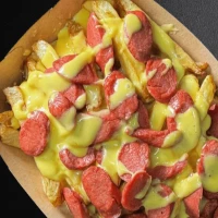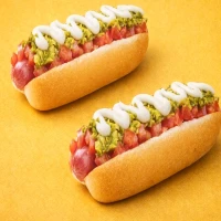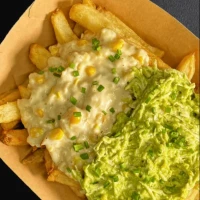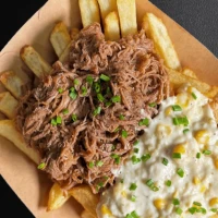 Mechada - choclo a la crema - tocino - pollo palta - cheddar - mozzarella - cebolla caramelizada - champiñones - vienesas - guacamole
