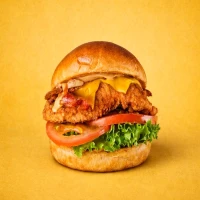 Pollo apanado, lechuga, tomate, queso cheddar, tocino y salsa thousand island.