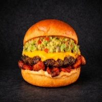 Hamburguersa de 150grs, chorizo, guacamole, queso cheddar, salsa de ajo y salsa chipotle.