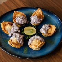 Masa de wantan relleno de camaron y cebolla flambeado al ...