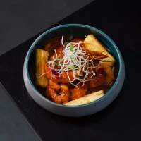 Trozos de tofu salteado con cebolla, tomate y soya. acomp...