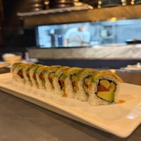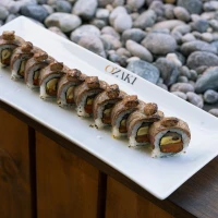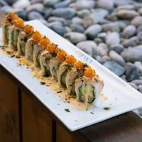 Camaron panko, palta, cebollin, envuelto en salmon con sl...