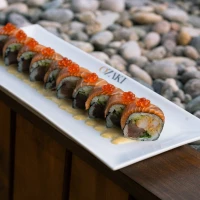 Camarón furai, pepino, atún y cebollin, cubierto en salmó...