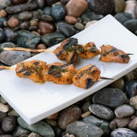 Brocheta de lomo de atún a la parrilla.