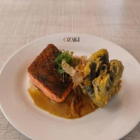 Salmón en bisque japonés con papas envueltas en nori-temp...